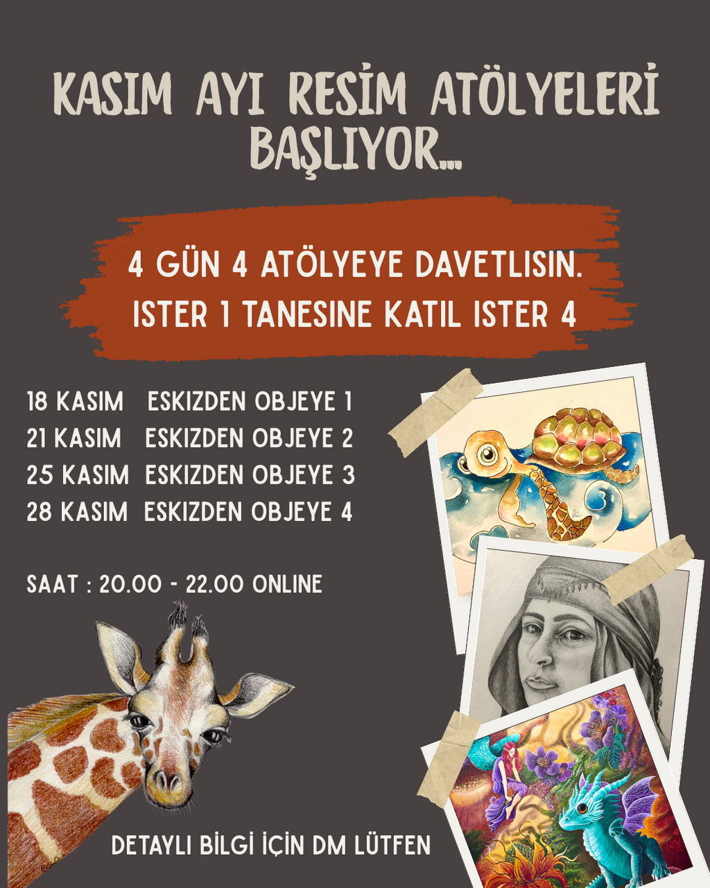 Sanat atölyelerim online canlı ve yüz yüze canlı grup katılımıyla resim atölyemde gerçekleşmektedir. Özel ders veya kendi grubunuzla atölye ve resim kursu talepleriniz için mail veya instagramdan iletişime geçebilirsiniz.