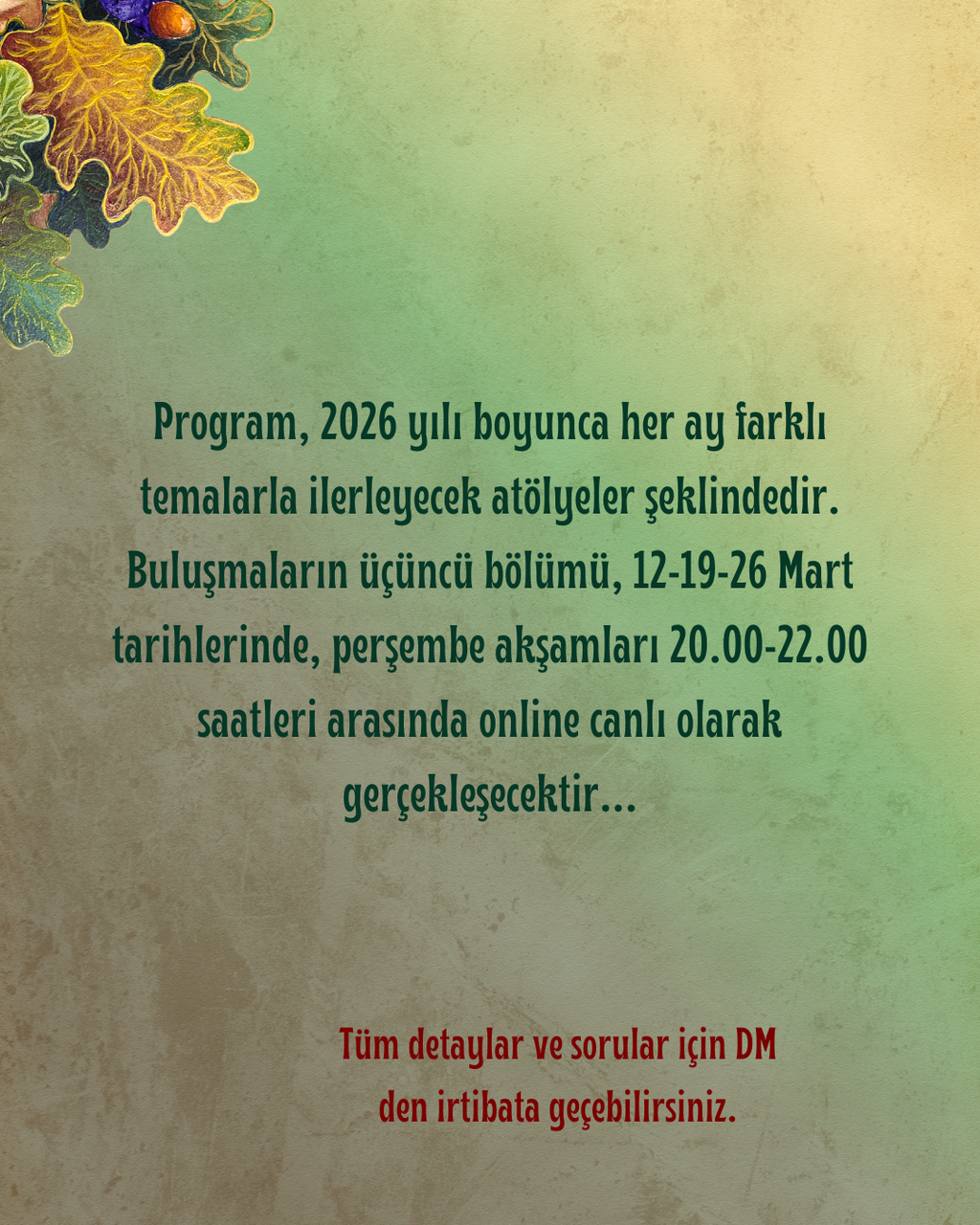 Buluşmalar 2026 yılı boyunca, her ay üç gün bir araya geleceğimiz atölyeler şeklinde sürecektir. Perşembe akşamları 19.30-21.30 arasında gerçekleşecek atölyelerin her biri ortak ana tema üzerinden çeşitlenen temalar ile ilerleyecek. Her bir atölyeye ayrı ayrı katılım sağlayabilirsiniz. Atölyelerin ayrı ayrı olmasının yanı sıra sürekliliği verimi açısından bir gerçektir ama şart değildir. Kavuşmak dileğiyle,